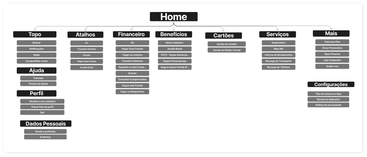 Após análise das funcionalidades que o aplicativo já tinha e com os insights da pesquisa foi definido a arquitetura de informação que o redesign do app iria ter.