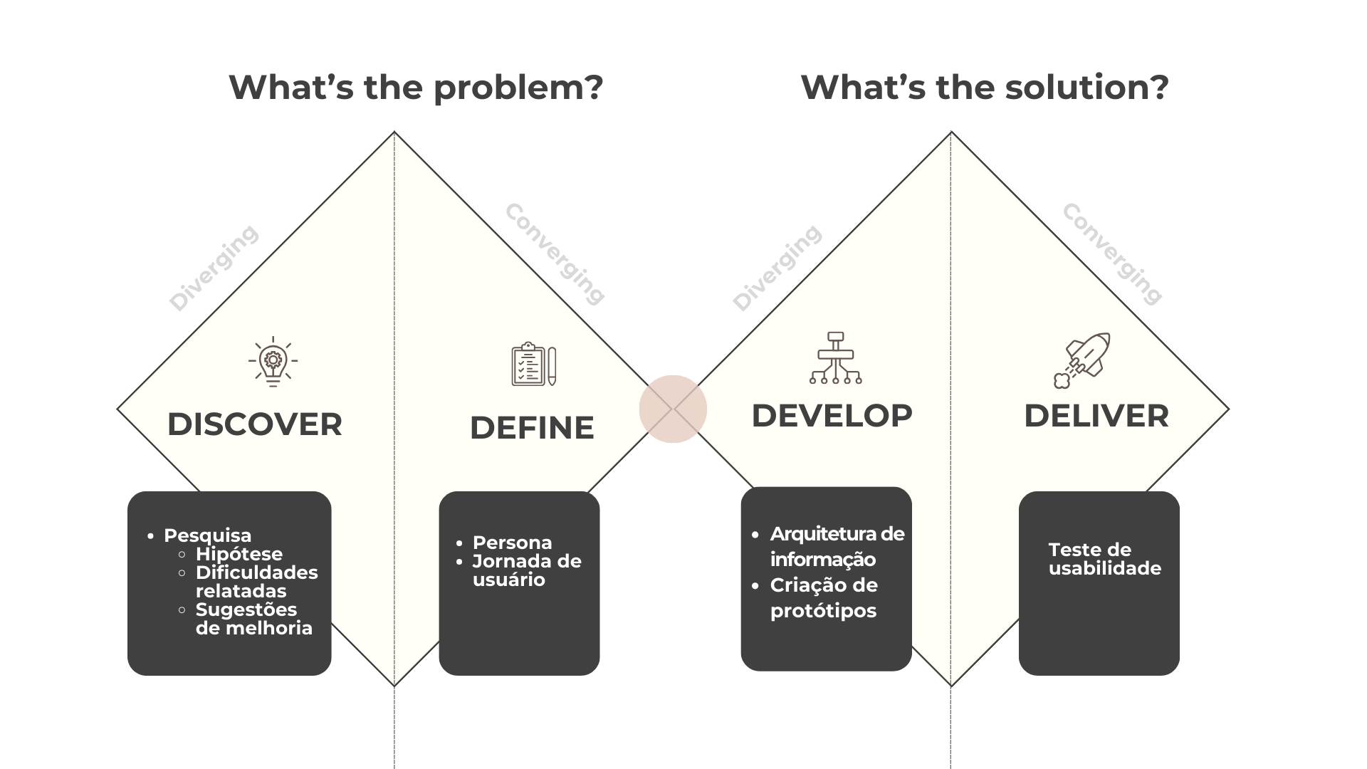 Nesse projeto vai seguido a abordagem do Double Diamond e em que cada etapa foi usado os métodos informados na imagem abaixo: